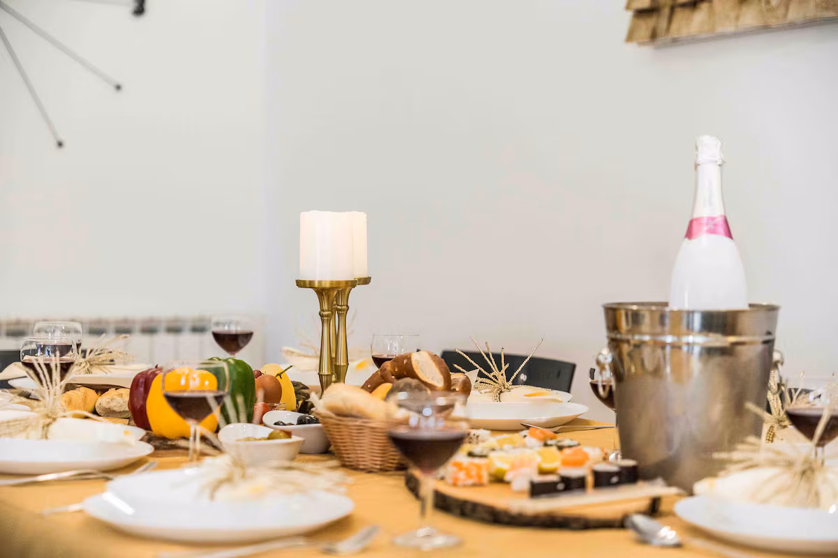 S velikim blagavaonskim stolom . Komoda s posuđem , čaše za vino i šampanjac kao i čaše za ostala alkoholna pića, tanjuri, šalice za kavu i pribor za jelo. Na upit dostupna je i dječja stolica.