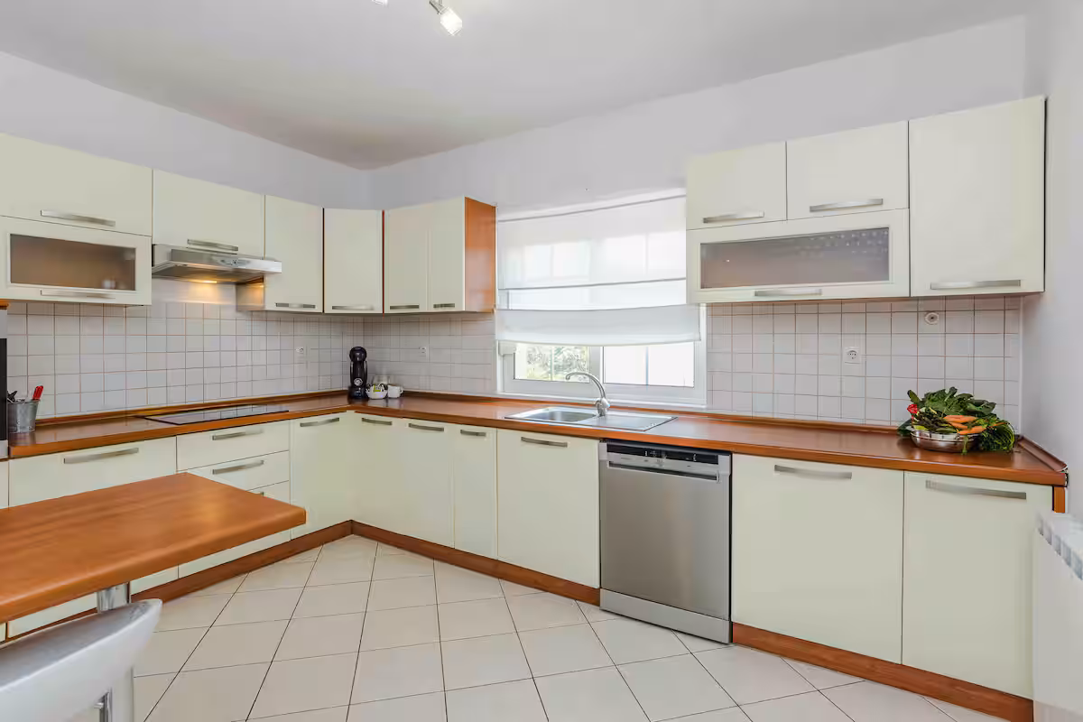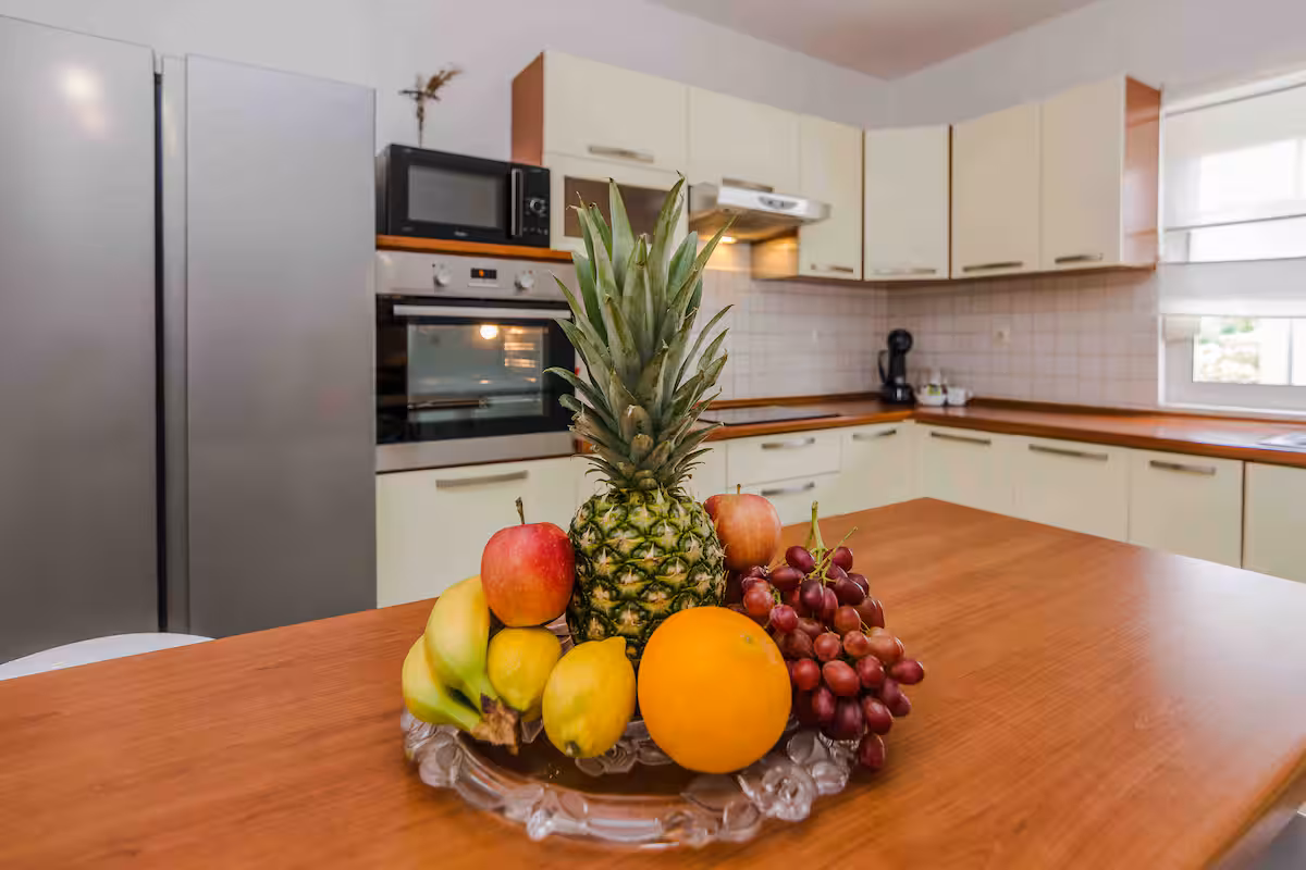 Kuhinja je potpuno opremljena posuđem, priborom za jelo, aparatom za kavu, perilicom posuđa, tosterom, mikrovalnom pećnicom i hladnjakom i zamrzivačem.