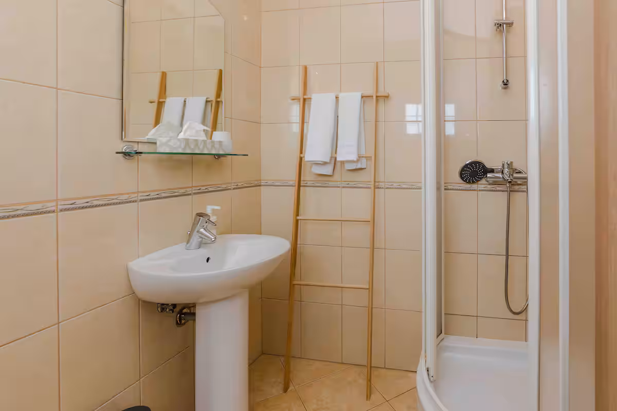 SPAVAĆA SOBA S KUPATILOM i terasom s pogledom na bazen i vrt. Krevet dimenzija 160 x 200 cm. Madraci koji jamče kvalitetan san. Antialergijski jastuci i posteljina. Na zahtjev dostupan baby krevet. U ovoj sobi nalazi se kupaonica sa tuš kabinom.