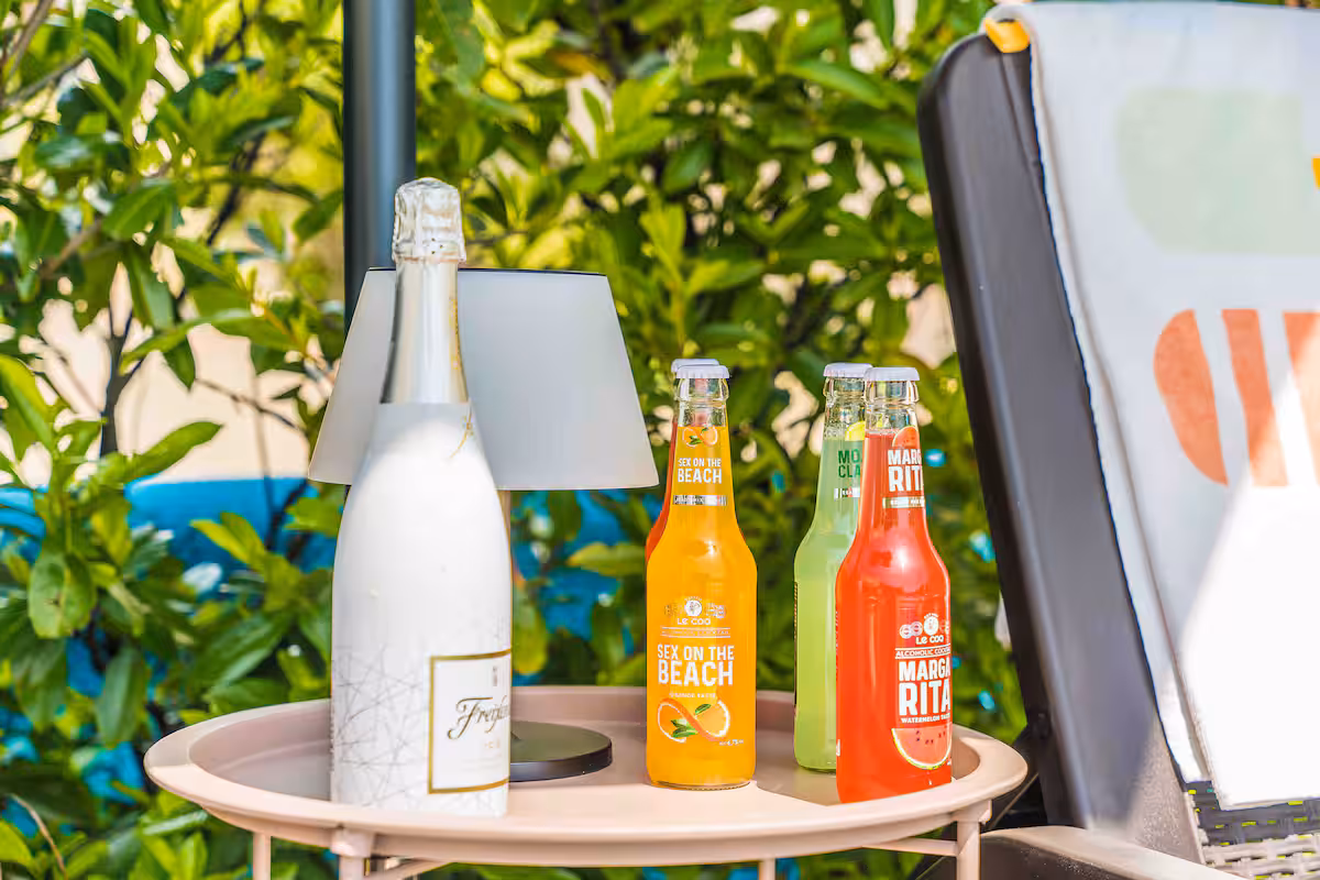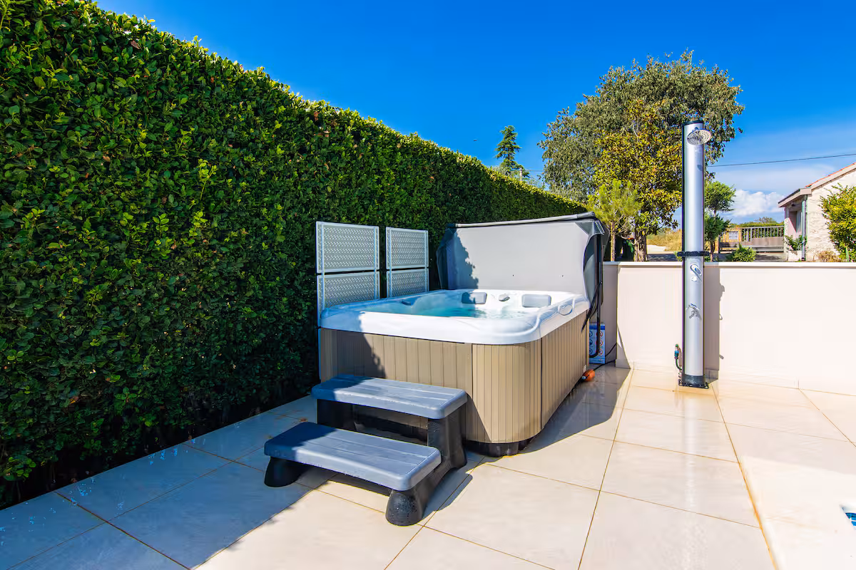 Nalazi se na sunčanom djelu dvorišta.Bazenska voda se tretira sa morskom soli i bogata je mineralima te je zdravija od vode koja se tretira klorom. Bazen je grijan,od kraja ožujka do kraja listopada ( garantirana temperatura vode od 26 C- 28 C ovisi o vremenskim ujetima). Na plaži su ležaljke i suncobrani. WHIRPOOL sa grijanom vodom 35 C.